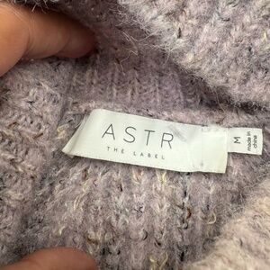 This ASTR women's pullover sweater in size M features a high neck and cold shoulder design. It is crafted from a blend of polyester, acrylic, nylon, wool, and elastane, offering a comfortable knit fabric. The sweater is solid purple, with long cold shoulder sleeves, suitable for casual fall occasions. Made in China, it requires dry cleaning.