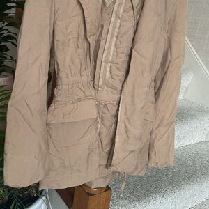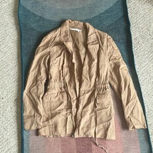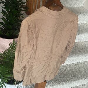 great pre loved condition size small, tan brown color, faux pockets, waist tie, collar, blazer jacket by ASTR. great office top for layering or casual jacket for lunch
