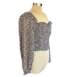 ASTR The Label Livie Black Wine Ditsy Top SM Sweetheart Neck Coquette Milkmaid. Ditsy floral print. Cropped length. Ruched front bodice. Long sleeves. Smocked back. Side zipper. Fitted bodice. Balloon sleeves with elastic cuff, creating a ruffle. Chiffon.