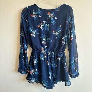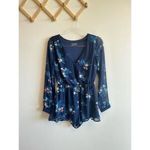 ASTR The Label Navy Floral Chiffon Long Sleeve V-Neck Romper Size Small