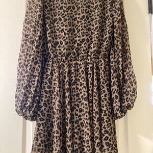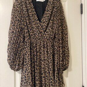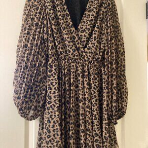 An exotic animal print dress that's perfect for the office and beyond. V neckline descends to a surplice front and meets at a cinched waist. Flowy mini skirt keeps this silhouette fun and flirty. Long cuffed sleeves.