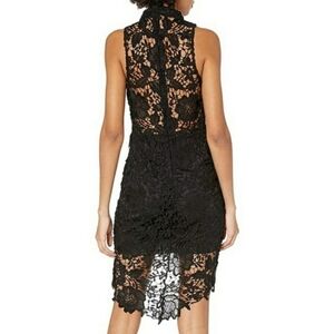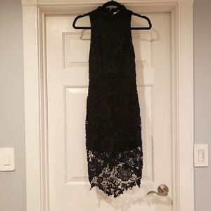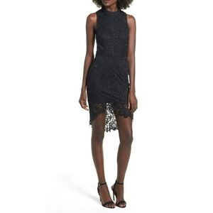 ASTR the Label Samantha dress. Black lace with hi-lo cut hemline. High neckline and sleeveless. Hidden back zipper close. Fully lined.