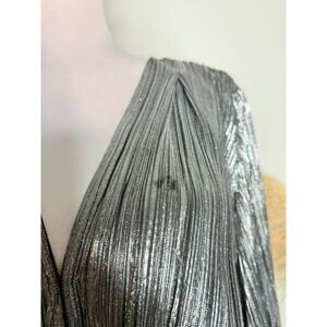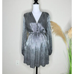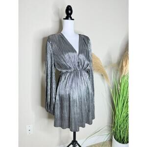 ASTR The Label Silver Metallic Glam Dress Midi VNeck Supernova Glitter Pleated