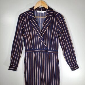 Features : Wide leg, long cuffed sleeves, notched collar, v-neck, blue and orange striped, faux belt detail with tortoise shell button, pockets, chic, professional, boss, office wear, pantsuit jumpsuit