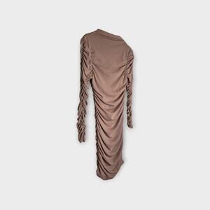 Tan-brown ruched long-sleeve bodycon dress with mock neck and gathered side detailing.