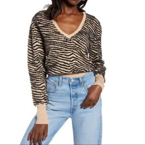 ASTR The Label Tiger Striped Fuzzy V-Neck Sweater Size Large Black Beige Animal