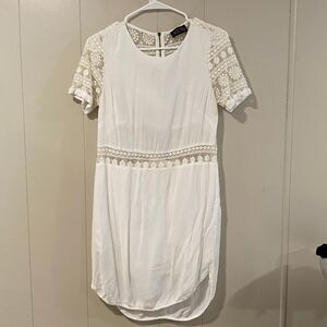 Beautiful ASTR The Label white short sleeve dress in size Small. Features delicate lace trim on the sleeves and waist, a silky soft fabric blend (57% silk ✨), and a high-low hem for a flattering fit.