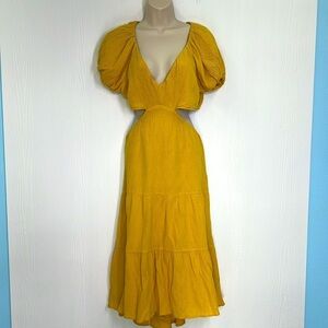 ASTR The Label - Winley Mustard Puff Sleeve Cutout Gaze Open Back Midi Dress Size Large