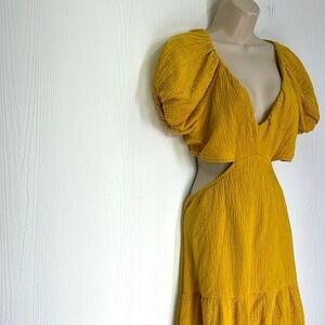 ASTR The Label - Wiley Mustard Puff Sleeve Cutout Gauze Open Back Midi Dress LG