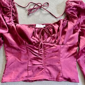 Romantic milkmaid-style blouse in a deep wine red satin. Features a structured bustier-inspired front with ruched bodice, long balloon sleeves with cinched cuffs, and a smocked back with tie detail. Concealed side zipper. New with tags, retail $69.