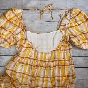 ASTR The Label Women's Ilana Yellow Plaid Midi Dress Puff Sleeve Open Back Large
