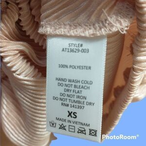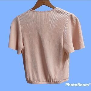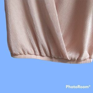 The gorgeous blouse has a sheen to the blush-colored ribbed knit. It gives off an air of elegance and softness. The sleeves are flutter-type and the bottom hem at the waist is elasticized for comfort and looks, all built around a surplice neckline. The bottom can be tucked in for professionalism or left out for a more relaxed croptop look.