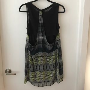 This shift dress has only been worn a couple of times and is in perfect condition. The yellow print detailing is sure to make you stand out but is tasteful and cool. The racer back has a sheer mesh underlay with a peekaboo cut out. Loose and flowy fit.