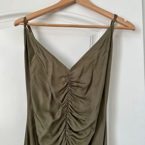 Silky satin long dress with thin adjustable straps. V-neck with ruched bust and side slit, beautiful olive green color, never been worn with tags still attached.