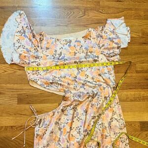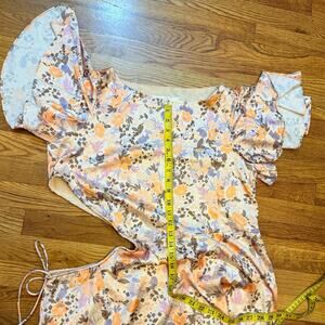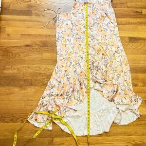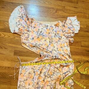 ASTR Women Medium Veida Floral CutoutTangerine Purple High Low Ruffle Midi Dress. Asymmetrical ruffle hem. Side cutout with drawstring. Lined slip to mini level. In great used condition with no issues.