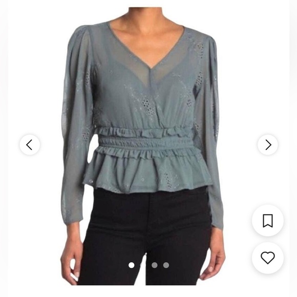 ASTR The Label, green blouse, eyelet detail, V-neck top, long sleeve top, peplum waist, feminine blouse, elegant top, casual chic, versatile fashion, women's clothing, stylish top, pre-owned fashion.