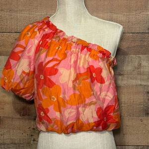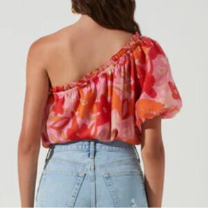EUC! ASTR the Label Atlanta top in pink and red multi floral print. Features a ruched one-shoulder design, a puffy sleeve, and a cropped cinched waist fit. Fully lined. The vibrant floral print makes this top super fun and feminine! Pair with some cut-off shorts for a more casual look or dress it up with some wide leg trousers.