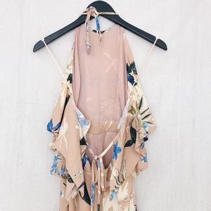 •Features: Halter top romper with blue and green floral pattern. Has a low back that ties together with a ruffle. Fitted waist which makes the romper very flattering but loose through hips so comfortable and able to fit many figures. The perfect outfit for a summer wedding!