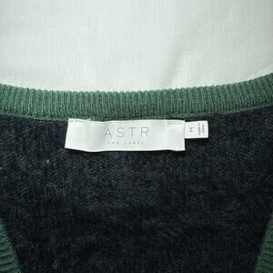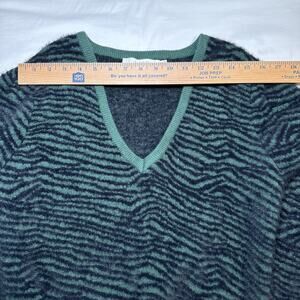 The ASTR the Label Fuzzy Green Black Striped Pullover V Neck Sweater is a stylish and comfortable option for women in size M. This sweater features a unique animal print pattern with a trendy v-neck design. Made from a blend of polyester, nylon, viscose, and acrylic, this knit sweater is perfect for casual or party occasions during the winter, fall, and spring seasons. The ribbed hems add a touch of accents to this pullover sweater from the brand Astr, making it a colorful and soft addition to any wardrobe.