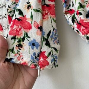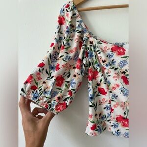 Sweetest cropped top blouse in red, white, and blue floral design. Hook and eye front accent. Side zipper closure. Puff sleeves with elastic. Smocking in the back for comfort. Linen/rayon. Good preloved condition.