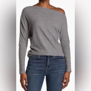 ASTR the Label Khaki Off the Shoulder Asymmetrical Soft Sweater, Size Small.