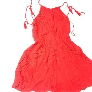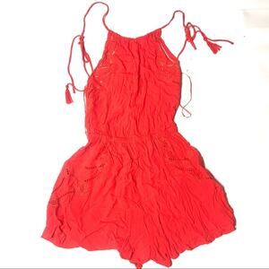 This airy romper is perfect for summer fun with its exposed back fastened with slender ties and insets of open stitching. Fit: this style fits true to size. - Crew neck - Sleeveless - Ties behind neck; ties behind back - Woven construction - Unlined - Approx. 3" inseam, 30.5" length (size S) - Imported