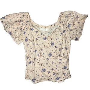 Slip into style with this Periwinkle Floral flutter sleeve top with a faux wrap silhouette for on-trend style.