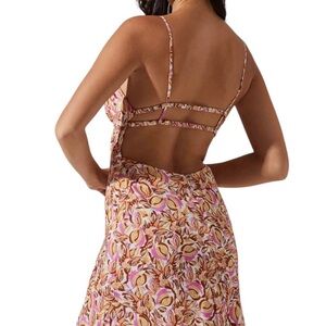 The Maritza Dress showcases a vibrant floral print. Square neckline leads to a smocked bust with a drawstring accent. Open back has supportive and adjustable straps. Midi-length skirt.