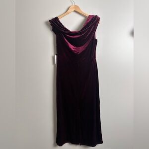 Rich velvet elevates this event-ready midi dress designed with an elongated neckline that dips off the shoulder and finished with a step-easing slit at the back hem.