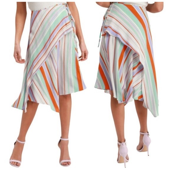 SEO Keywords: wrap skirt, summer fashion, midi skirt, colorful stripes, lightweight fabric, high waist skirt, handkerchief hem, ASTR the Label, casual wear, beach style