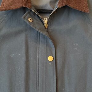 Stylish women's jacket featuring a sleek navy design with a contrasting brown collar. Perfect for versatile wear. In good condition with some discoloration on the front of the jacket shown in pictures. Size Medium!