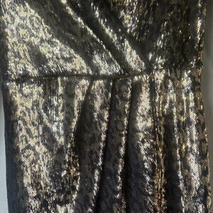 Gold leopard printed sequin (100% Polyester). Hourglass. Long sleeves. V-neckline. Hidden side seam zipper closure. Partially lined. 34" from shoulder to hemline. Imported.