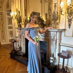 Size: Medium, Size 8, Bust: 35"-36", Waist: 28"-29", Hip: 38"-39", Slate Blue, Like New, only worn once for a wedding as a bridesmaid. The Venetia Dress features an oof-shoulder neckline with a statement ruffle trim. Darted bust leads to a maxi-length skirt with a side slit accent. Concealed back zip closure.