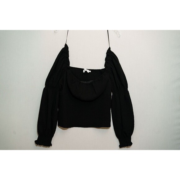 A black ASTR blouse for women in size L with a square neck, long puff sleeves, and a cropped babydoll style. Made of textured fabric with ruched detailing, this top features a trendy square neckline and voluminous puff sleeves for a stylish look.