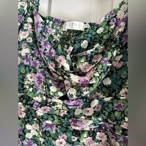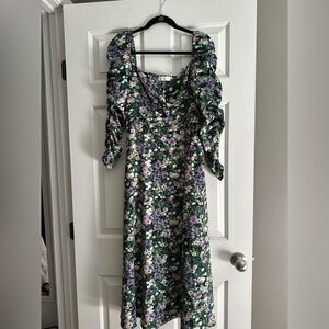 Step into elegance with this Astr sundress, showcasing a vibrant green and purple floral pattern. Designed with long puff sleeves and a sweetheart neckline, this dress is perfect for a wedding guest or cocktail occasion. The fitted waist and flowing A-line skirt create a romantic silhouette, ideal for a night out.