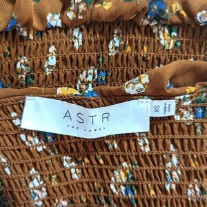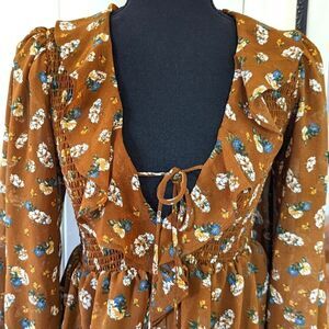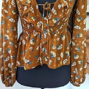 ASTR the Label Brown Floral Long Sleeve Ruffle Ditsy Smocked Bodice Top, sz XS, ruffles on the collar and along the waist, v-neckline with tie detail, long, flowy sleeves, floral print on the front and back