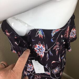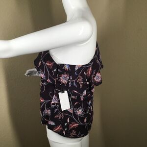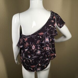 Black sleeveless ruffle one shoulder top with flowers. Half zipper on left side. New with tags