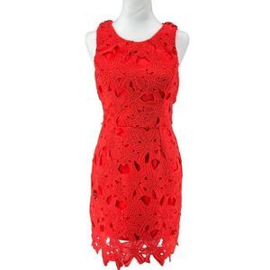 This striking red lace dress offers a timeless silhouette with intricate floral patterns and a flattering fit. The lined interior ensures comfort, while the back zipper provides effortless wear. Its sleeveless design and delicate lace overlay make it an elegant choice, radiating sophistication and charm.