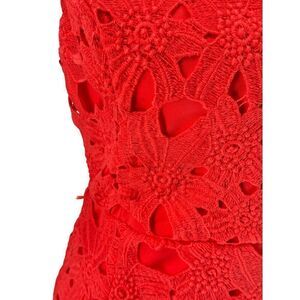 This striking red lace dress offers a timeless silhouette with intricate floral patterns and a flattering fit. The lined interior ensures comfort, while the back zipper provides effortless wear. Its sleeveless design and delicate lace overlay make it an elegant choice, radiating sophistication and charm.