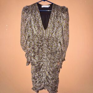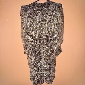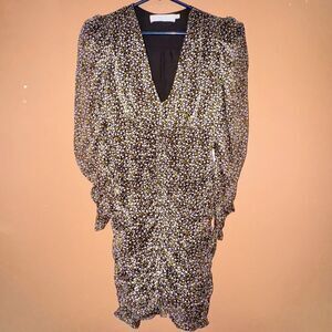 In excellent condition, this dress features a beautiful black and yellow floral graphic, complemented by a delicate lace skirt and sleeves.
