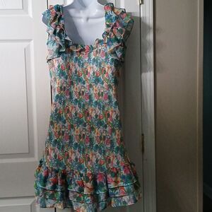 ASTR The Label Green Pink Blue Floral Smocked Dress Flutter Sleeve Sz XL NWOT