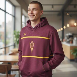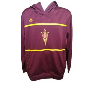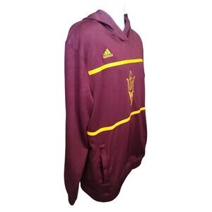 Embrace the spirit of the Arizona State Sun Devils with this maroon Adidas Sideline Hoodie Sweatshirt, designed for the ultimate fan experience. The men's XL size ensures a comfortable fit for game day or any casual occasion. Climalite technology is woven into the fabric, providing you with a sweatshirt that keeps you dry and comfortable as you cheer on your team. Whether you're at the stadium or on the street, this hoodie is an emblem of your devotion to the Sun Devils. It's a classic piece of sports apparel that combines functionality with the bold aesthetics of NCAA football fandom. The iconic adidas branding ties the look together, making it a versatile addition to any supporter's wardrobe. My camera picked up a purplish color but the sweatshirt is a true burgundy color.