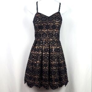 Super cute mini cocktail dress in black over nude underlay. Has gorgeous design with rose gold sequins throughout. Zips on back and is fully lined with adjustable straps. In excellent condition.