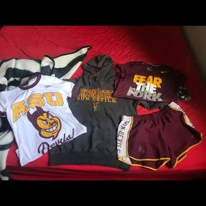 3 items used, 1 shirt w/ tags. ASU women’s bundle. White tee-sz M, hoodie-sz L, shorts-sz M bad tee w/tags size L