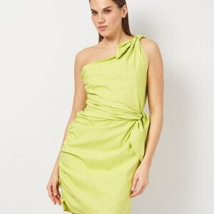 Short dress with asymmetrical neckline and knot detail. Draped fabric with side tie. Tonal lined interior. Side hidden in-seam zip closure.