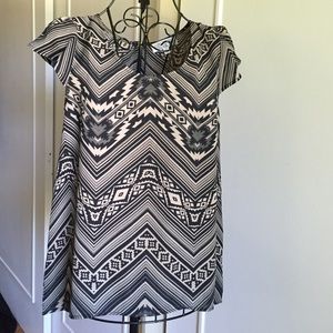 Cute cap sleeve top made in Mexico with an Aztec print in light brown and black. Hits at low hip, asymmetrical hem an easy fit. Back zipper.