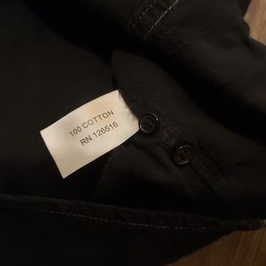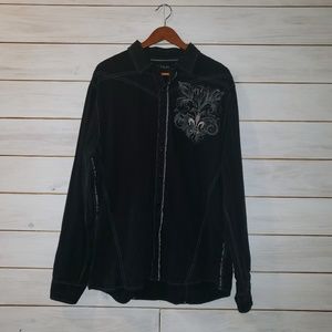 Button down collared shirt features gray stitching, screen printing, and embroidery. Embroidery on the front left breast is a fleur de lis. Stitching on the back features an additional fleur de lis and the word, "Audeamus." Machine washable for easy care.