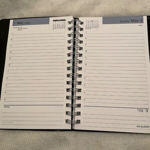 Handy, portable, convenient and easy to use. Keep track of daily appointments, tasks, accomplishments, special dates. Black, spiral bound, white pages.