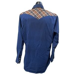 Capture the essence of Western style with this vintage ATB Authentic Western shirt, featuring a rich navy blue fabric and striking plaid shoulder yokes. This shirt blends traditional cowboy elements with a touch of rugged charm, making it a perfect piece for any Western-inspired wardrobe.