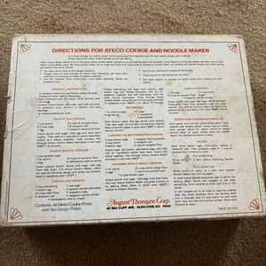 ATECO The Original Cookie & Noodle Maker No. 685 Complete. Glen Cove, New York. Recipes on back. Good condition, box has some damage.